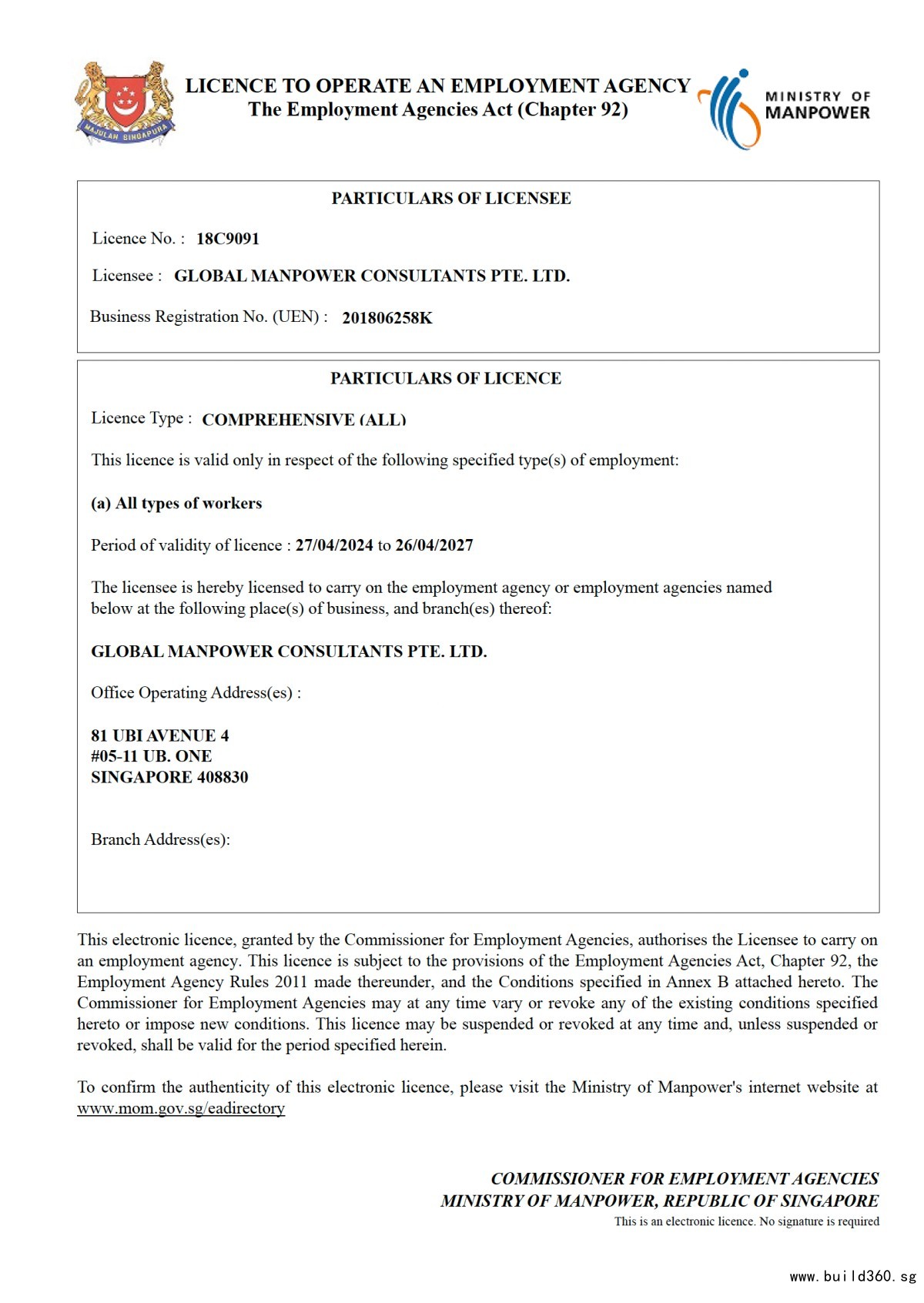 This licence is issued under the Employment Agencies Act (Chapter 92) and is regulated by the Ministry of Manpower. It demonstrates that the company operates as a legitimate and compliant employment agency, providing reliable and professional manpower services to employers and job seekers.